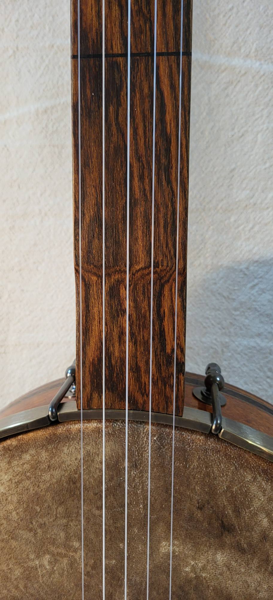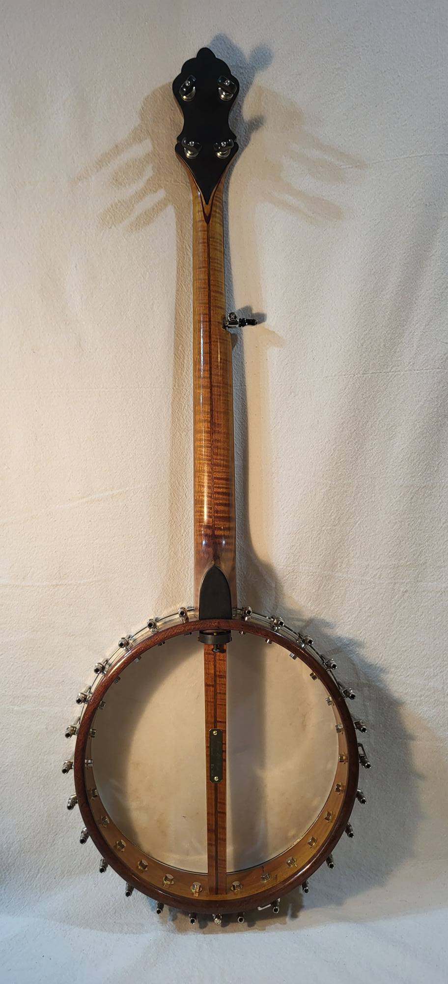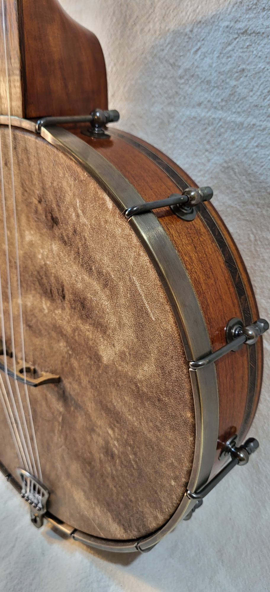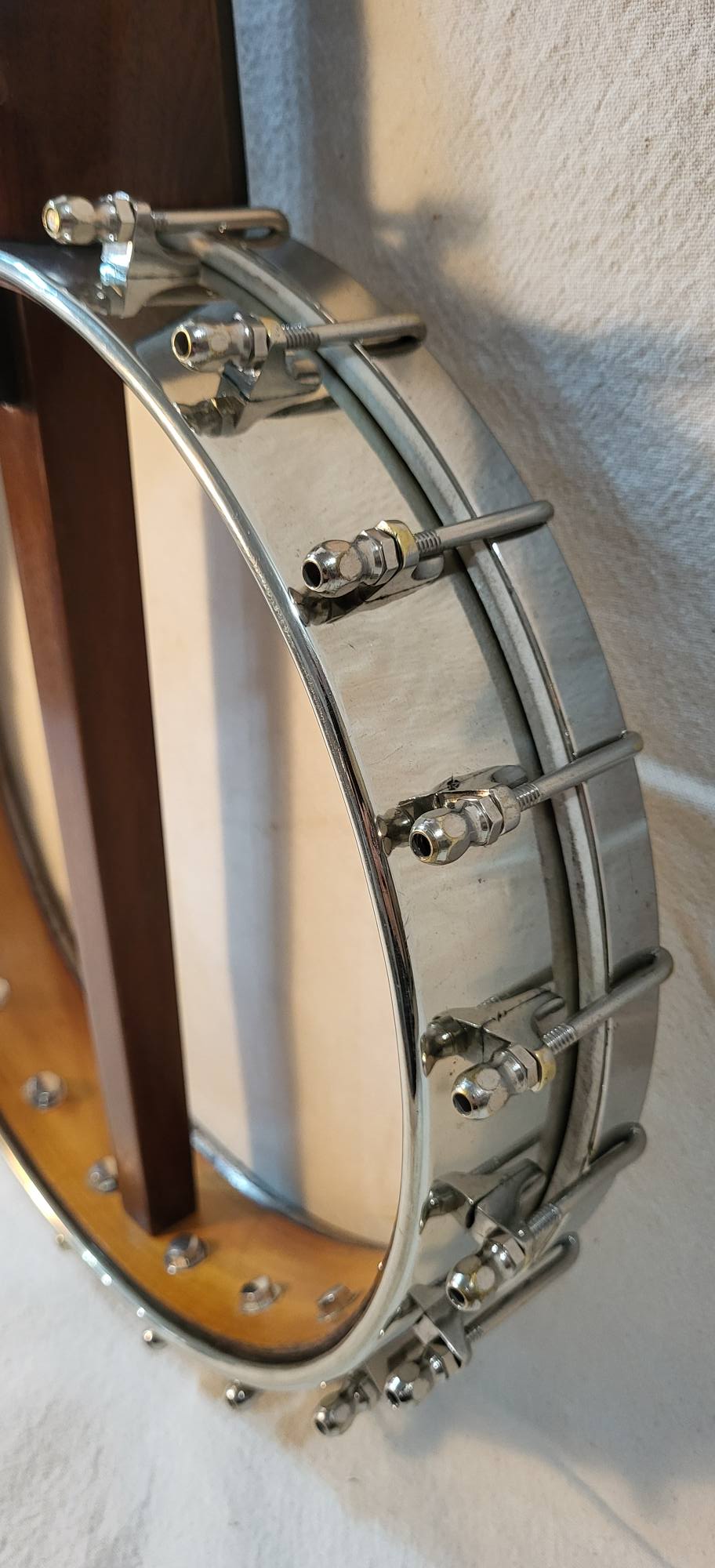 11 inches curly maple rim with a grenadillo rim cap and marquetry binding. Round rod tone ring , 3 inches deep pot ,