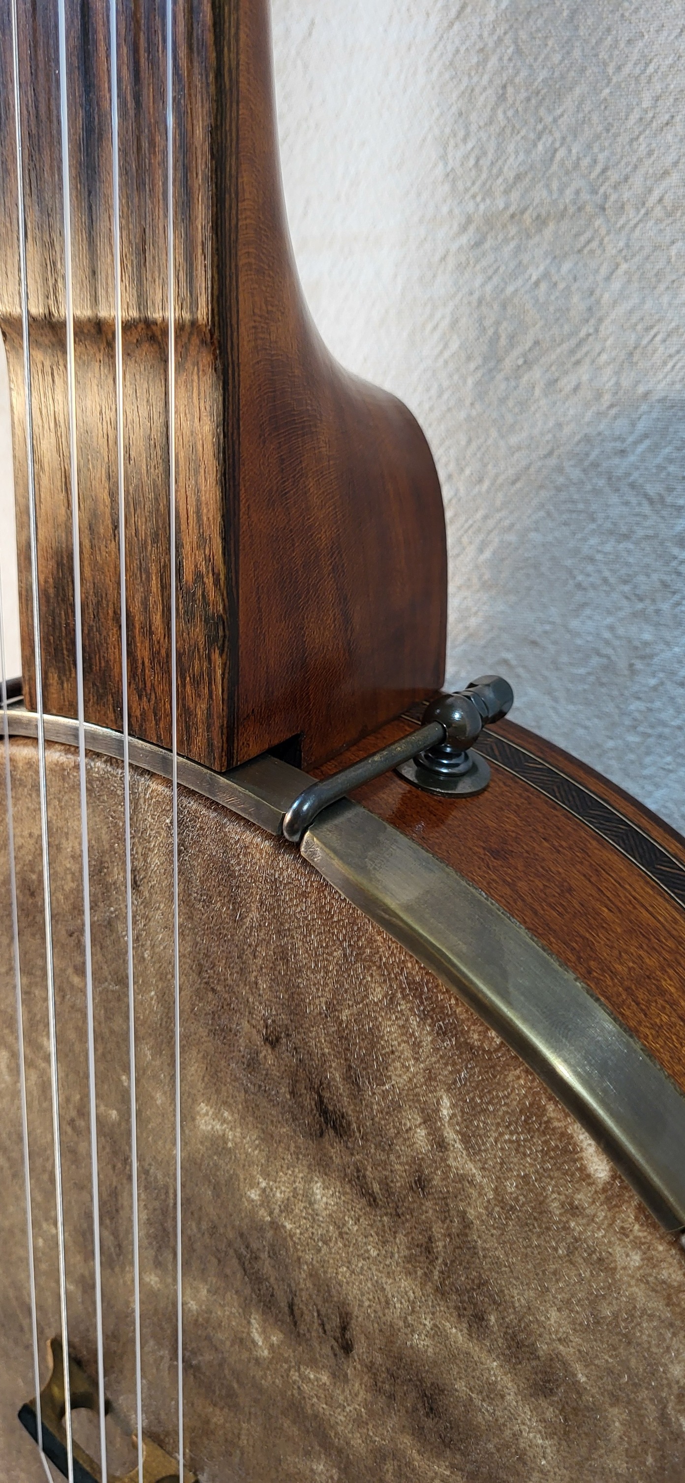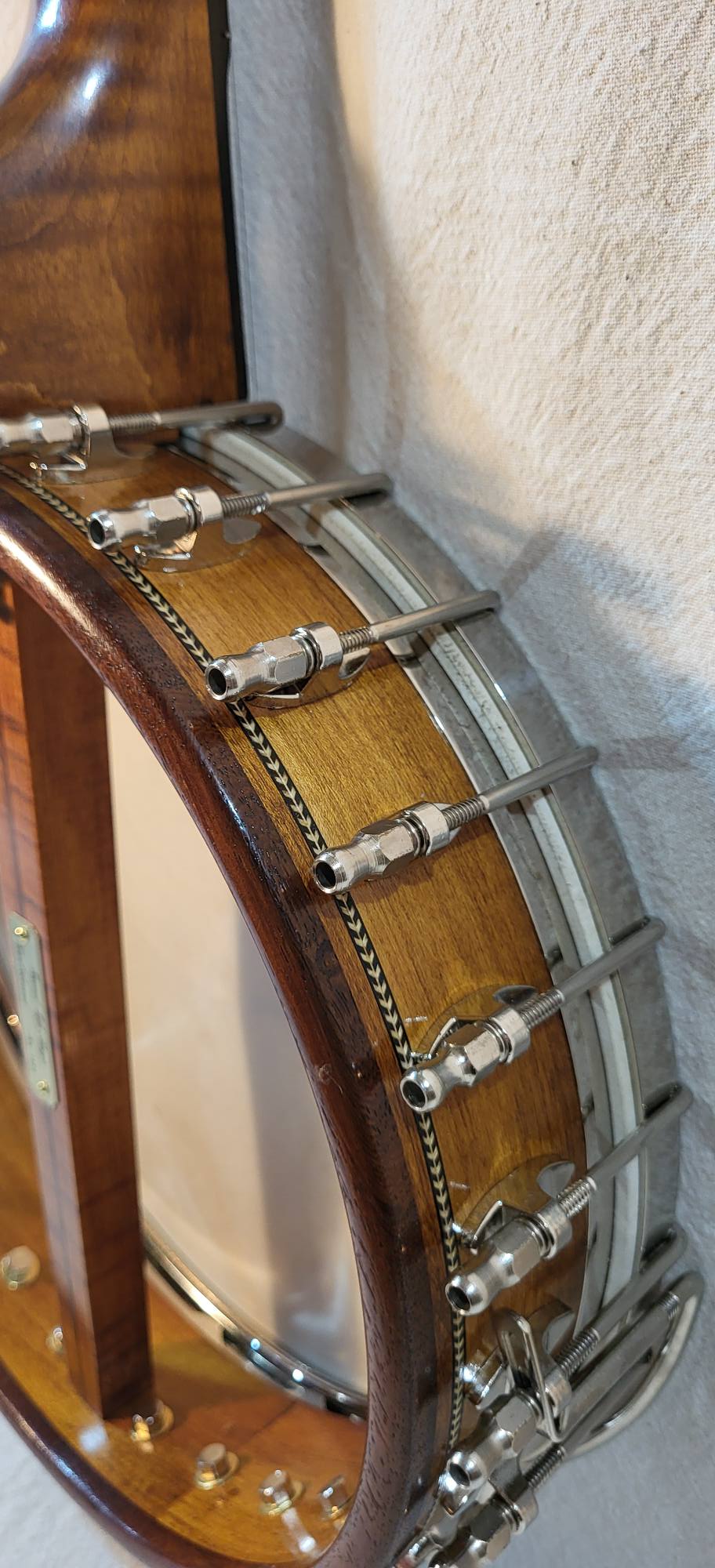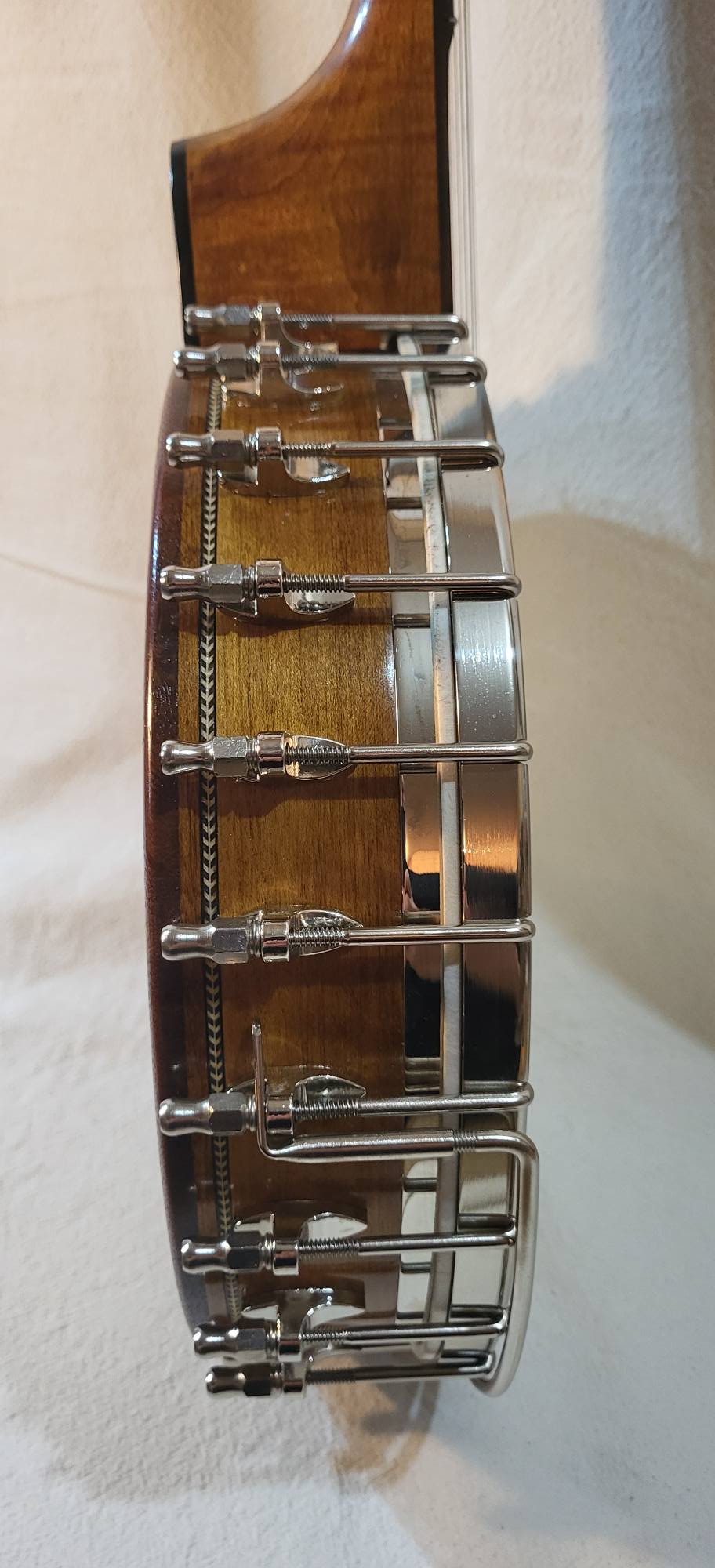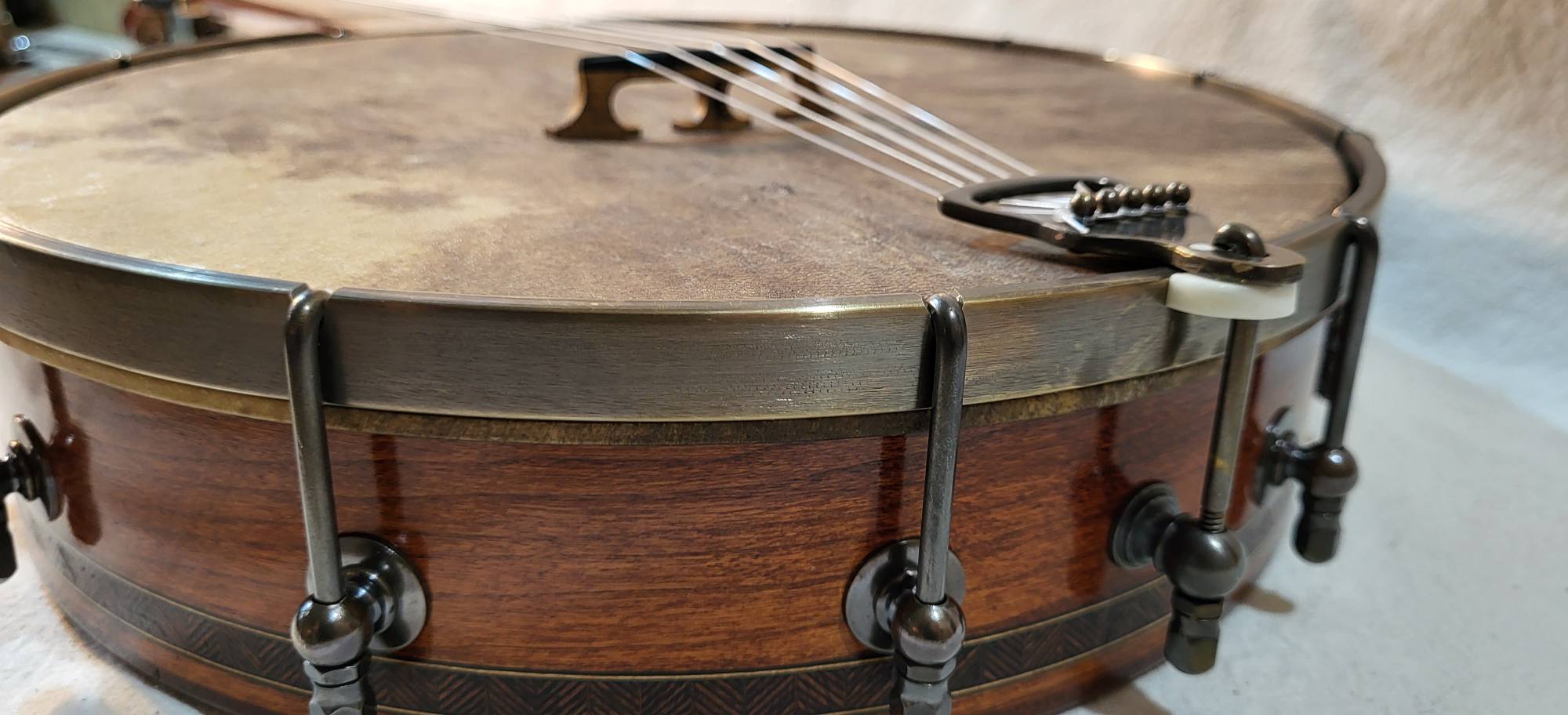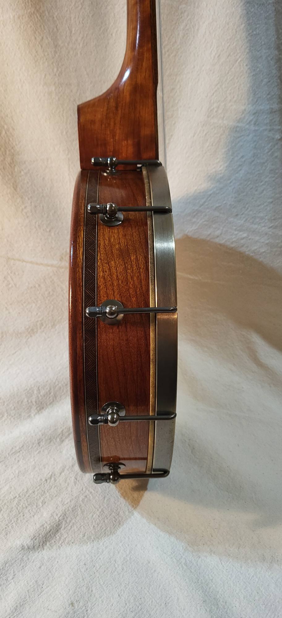 11 inches curly maple rim with a grenadillo rim cap and marquetry binding. Round rod tone ring , 3 inches deep pot ,