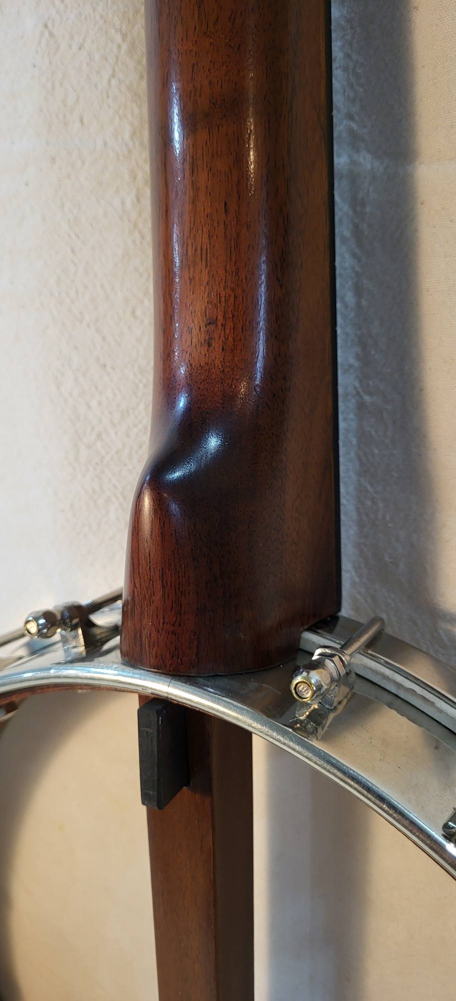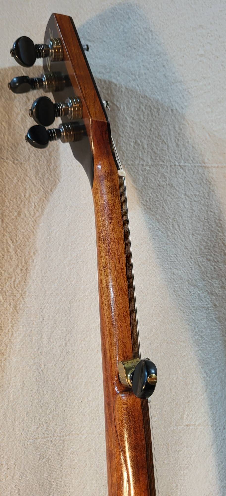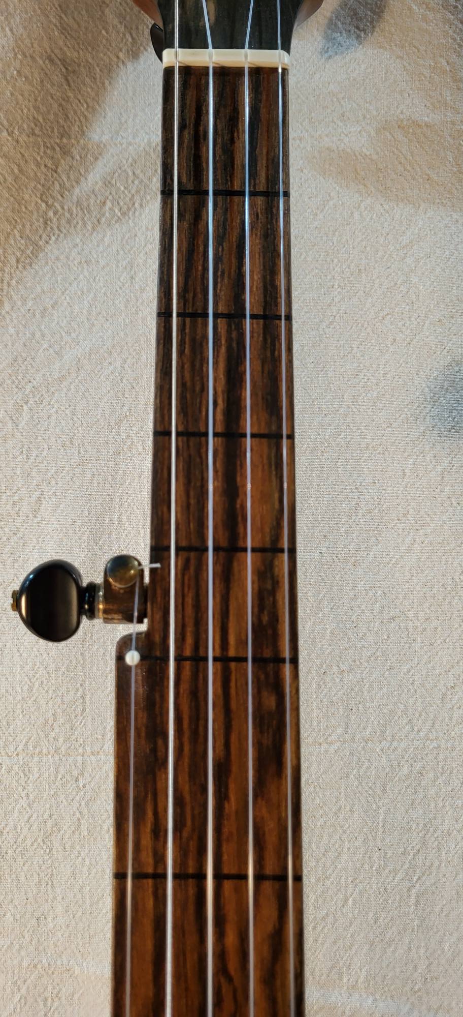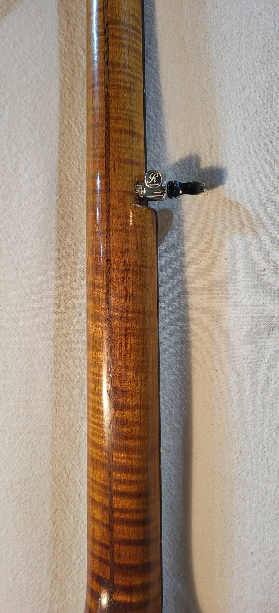 Hand made conversion to five strings ebony and hard maple 3 piece neck. Gotoh tuners. Nickel silver frets, two way truss rod. Low action and 3/8 inch string spacings.