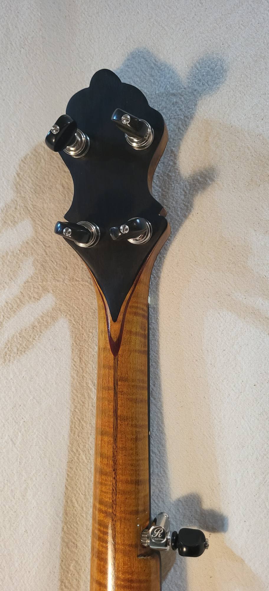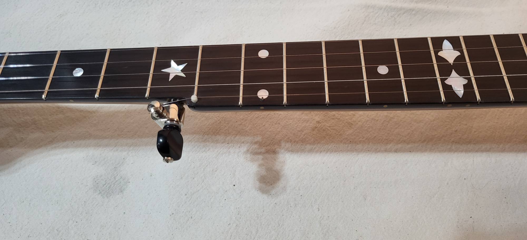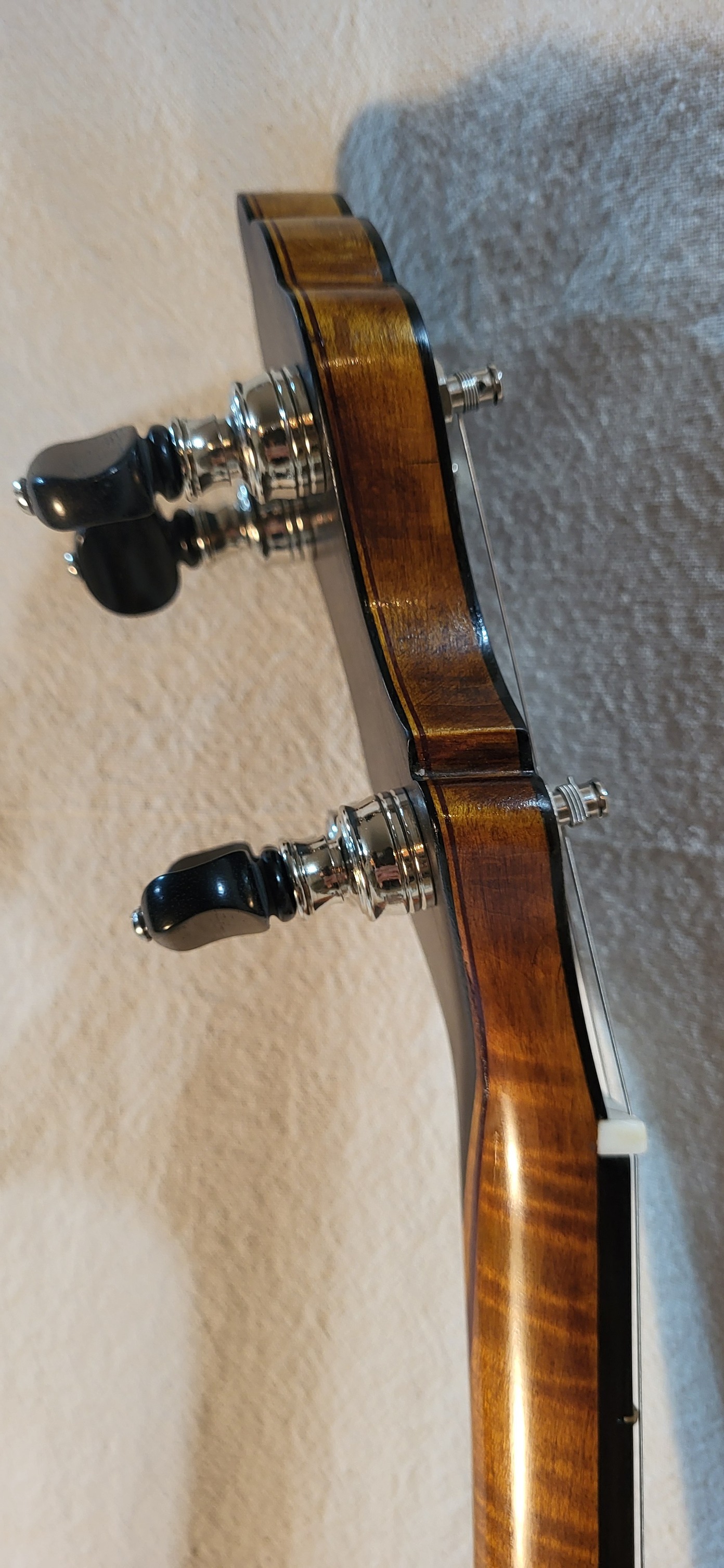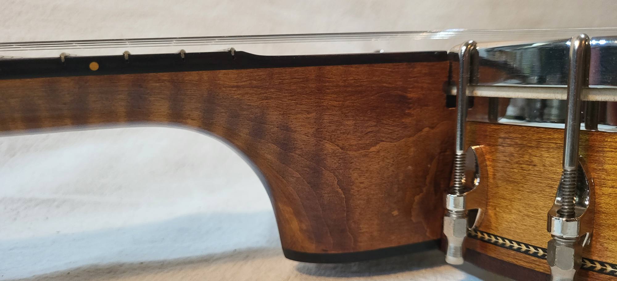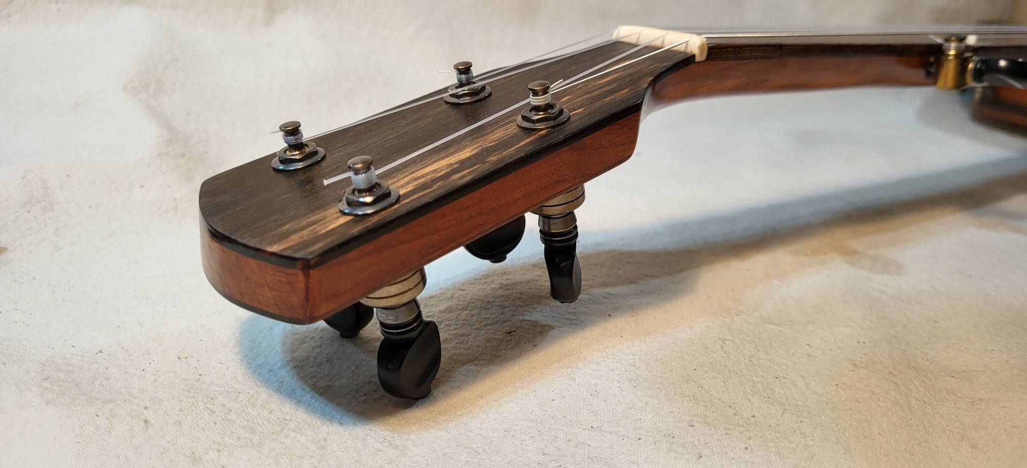 Hand made conversion to five strings ebony and hard maple 3 piece neck. Gotoh tuners. Nickel silver frets, two way truss rod. Low action and 3/8 inch string spacings.