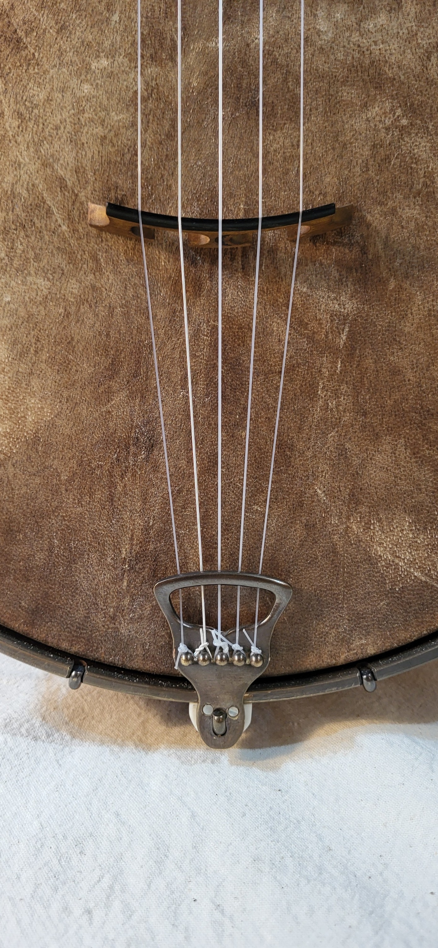 The tailpiece is new and hand made by me out of 1/8 inch thick nickel / silver . New nickel plated brass wire armrest. New Goatskin mounted on a brass flesh hoop.
