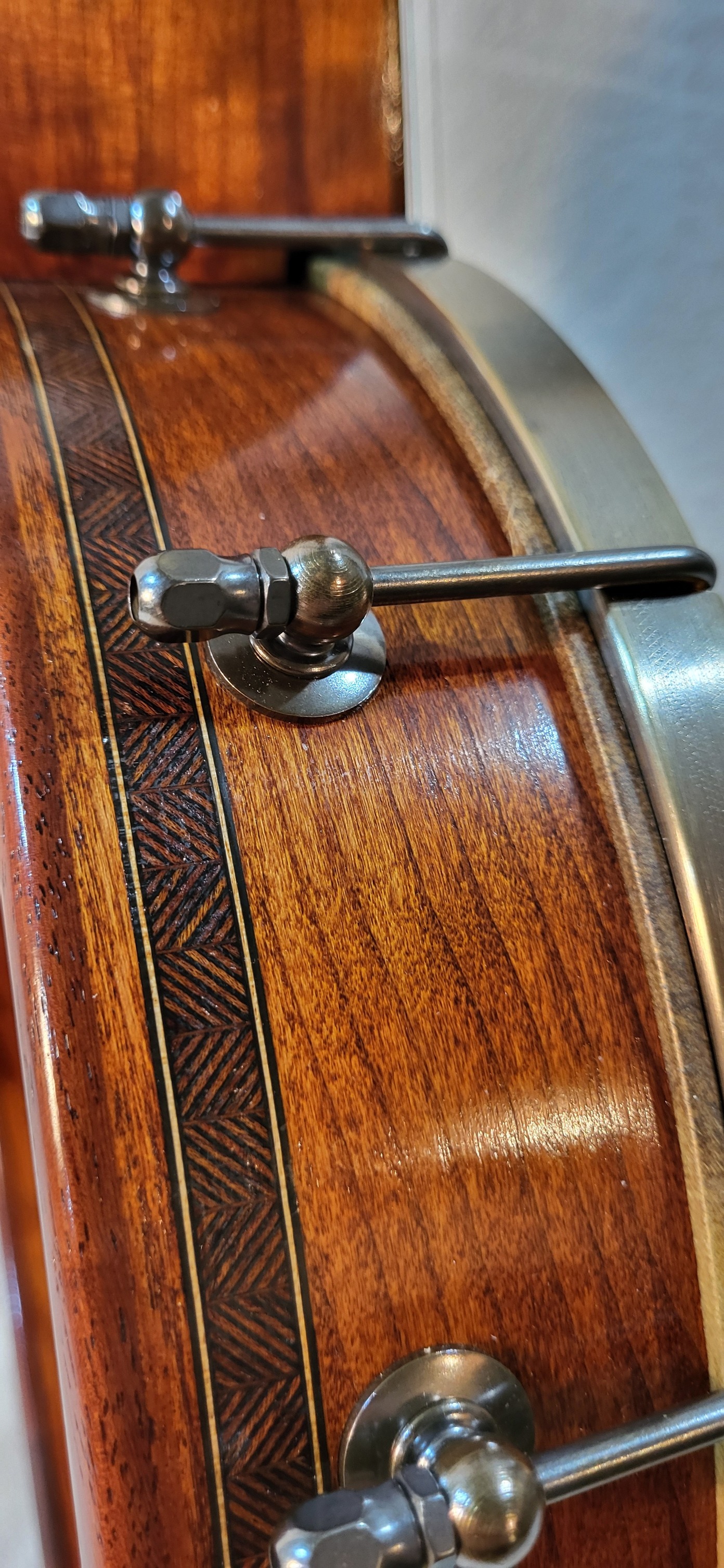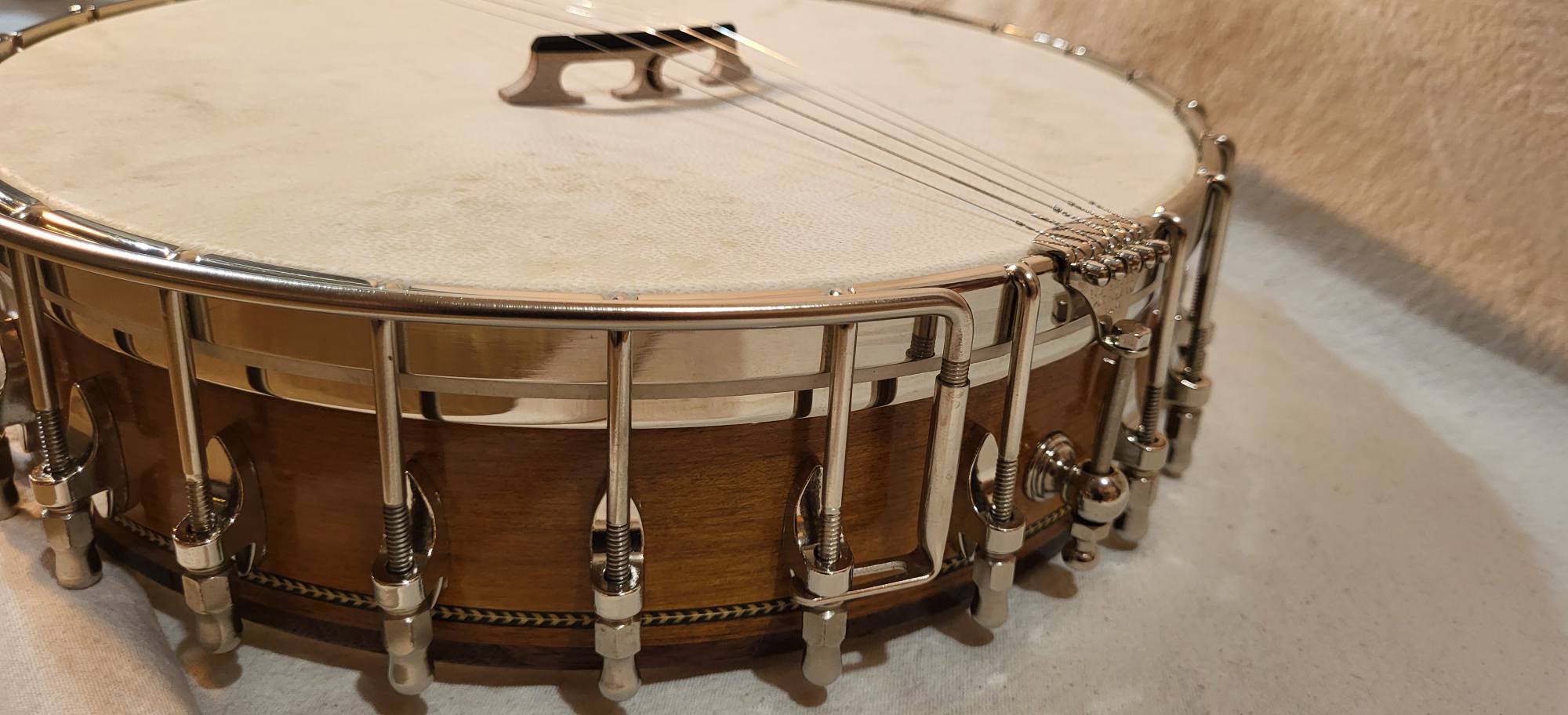 12 inches hard maple rim with Granadillo rim cap, marquetry binding and Whyte Laydie tone ring.