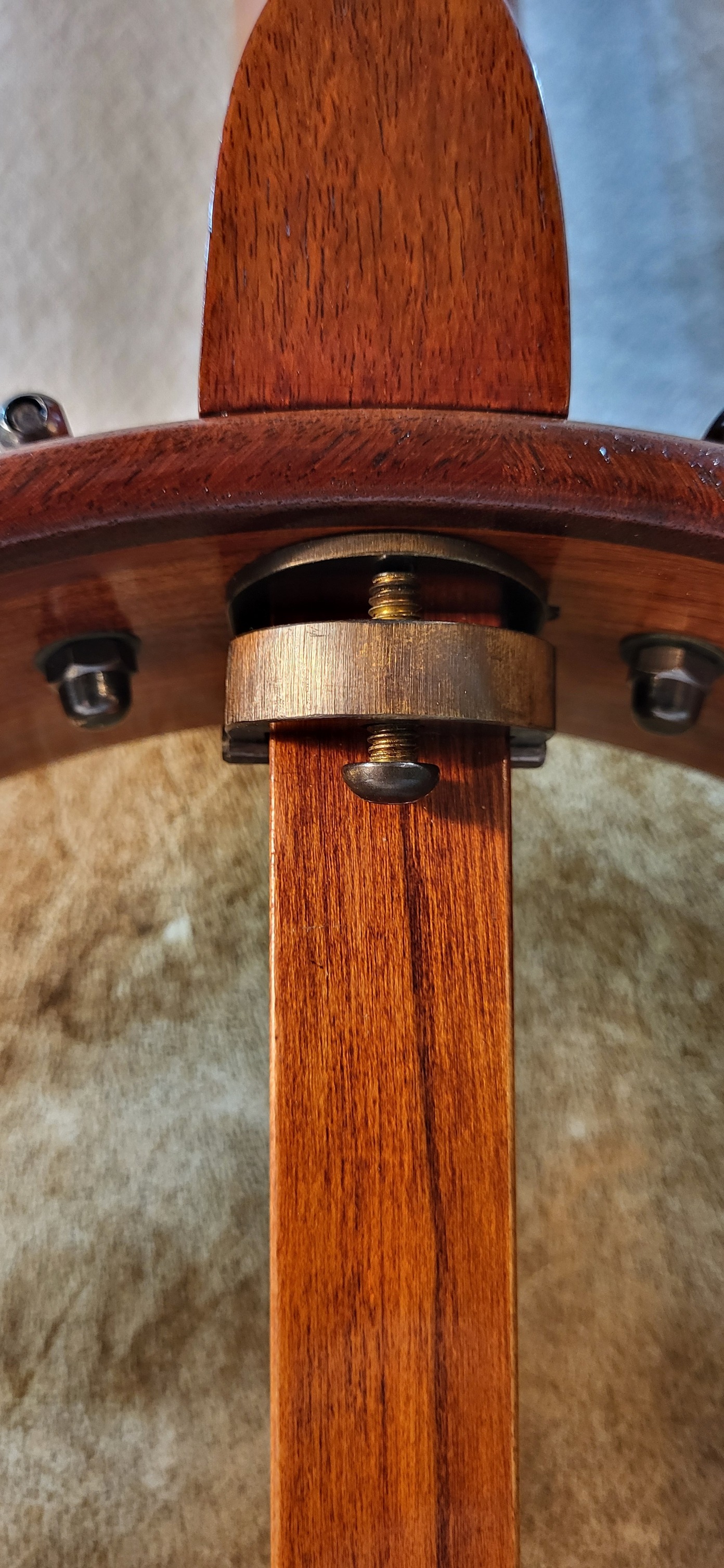Goat skin supplied by Jeff Menzies and mounted on a brass hoop to fit the rim here in my shop.