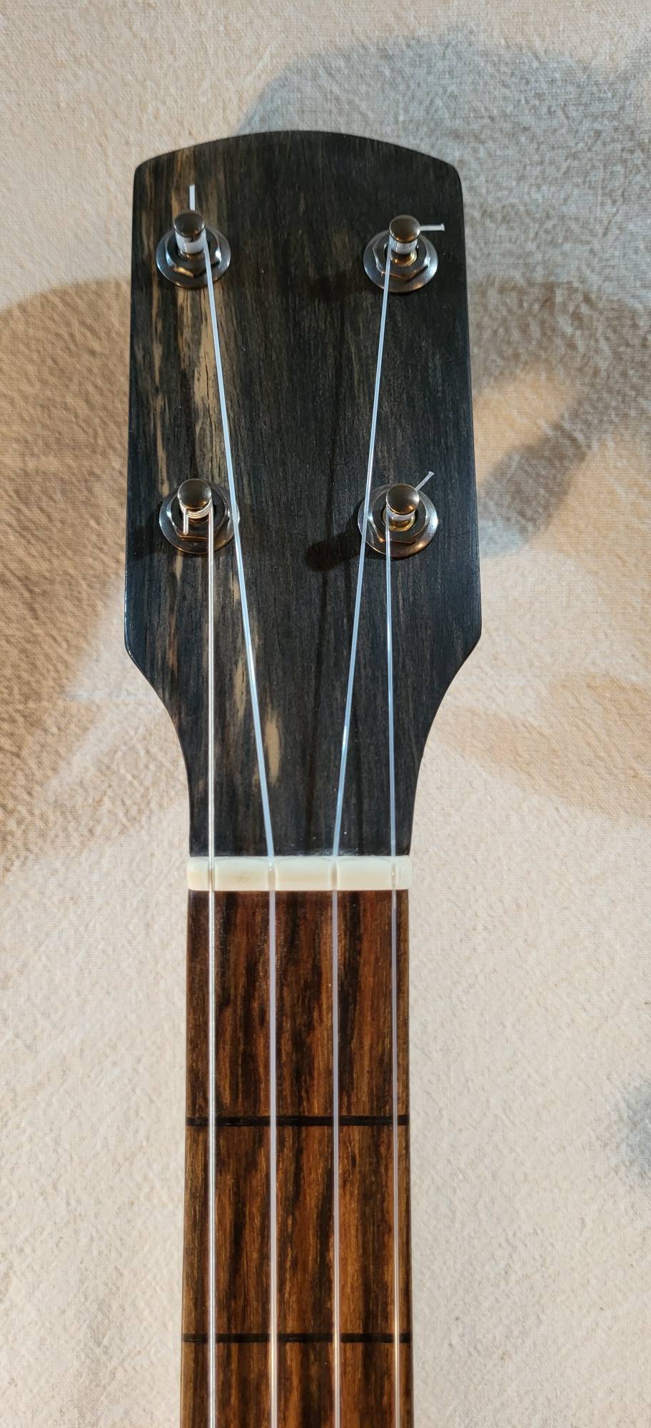 One piece black cherry and ebony neck , maple note markers. Can be played between 24 1/2 and 26 1/2 inches scale.