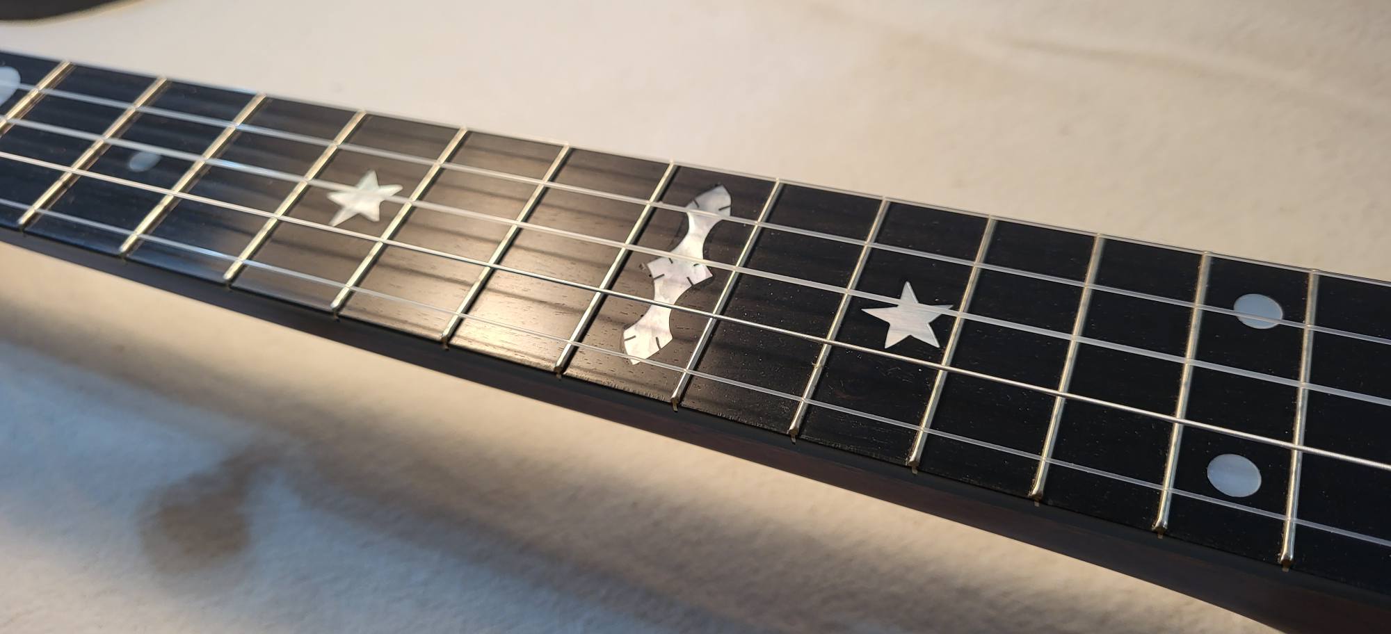Mother of pearl and brass dots, spalted maple fleur de lis on the headstock.