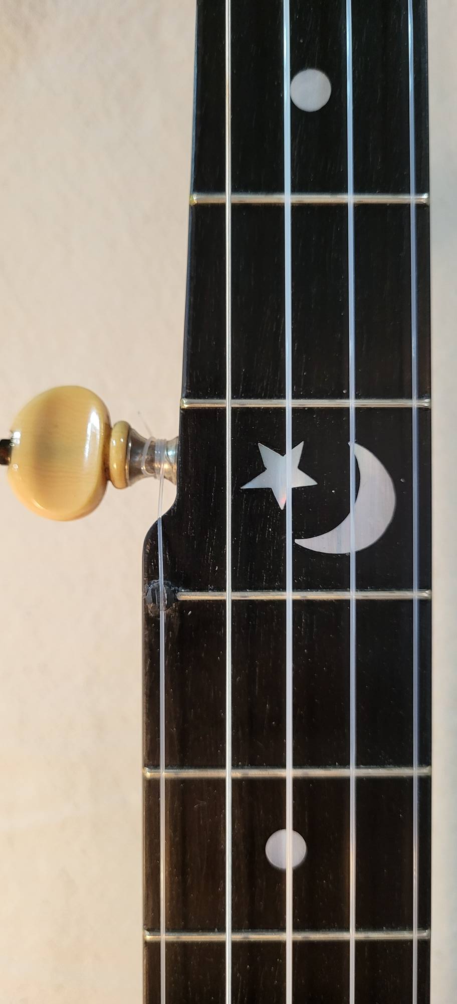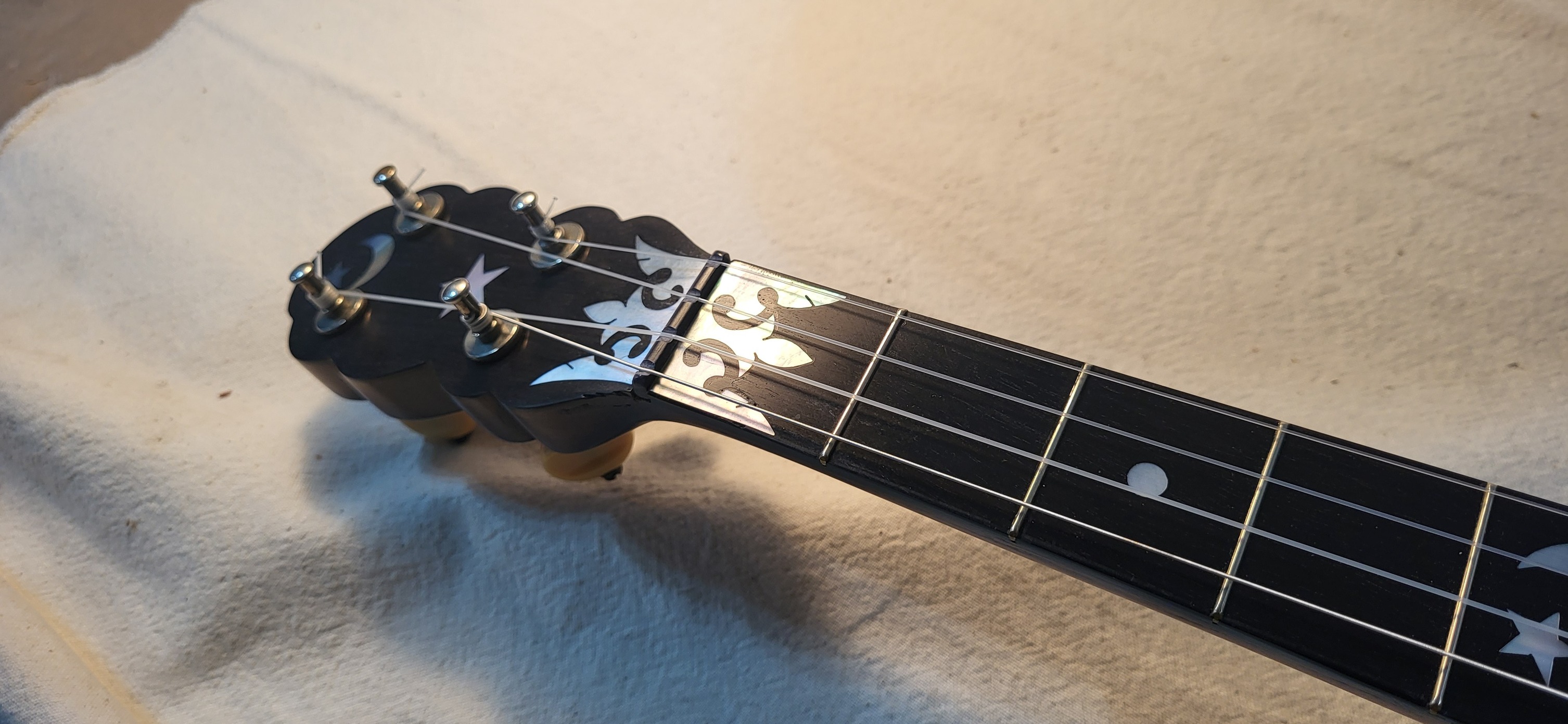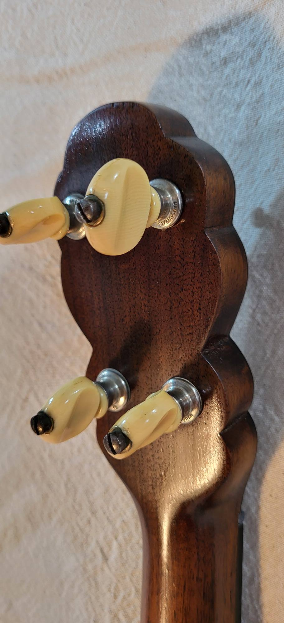 Before restoration this banjo had no hardware and no tuning pegs. I replaced the missing hardware with the same parts than the original from another Luscomb that I bought for parts many years ago. Eight tension hooks and two tension nut are different but with the same thread. There were also two small inlays missing, I used pearl from vintage inlays.